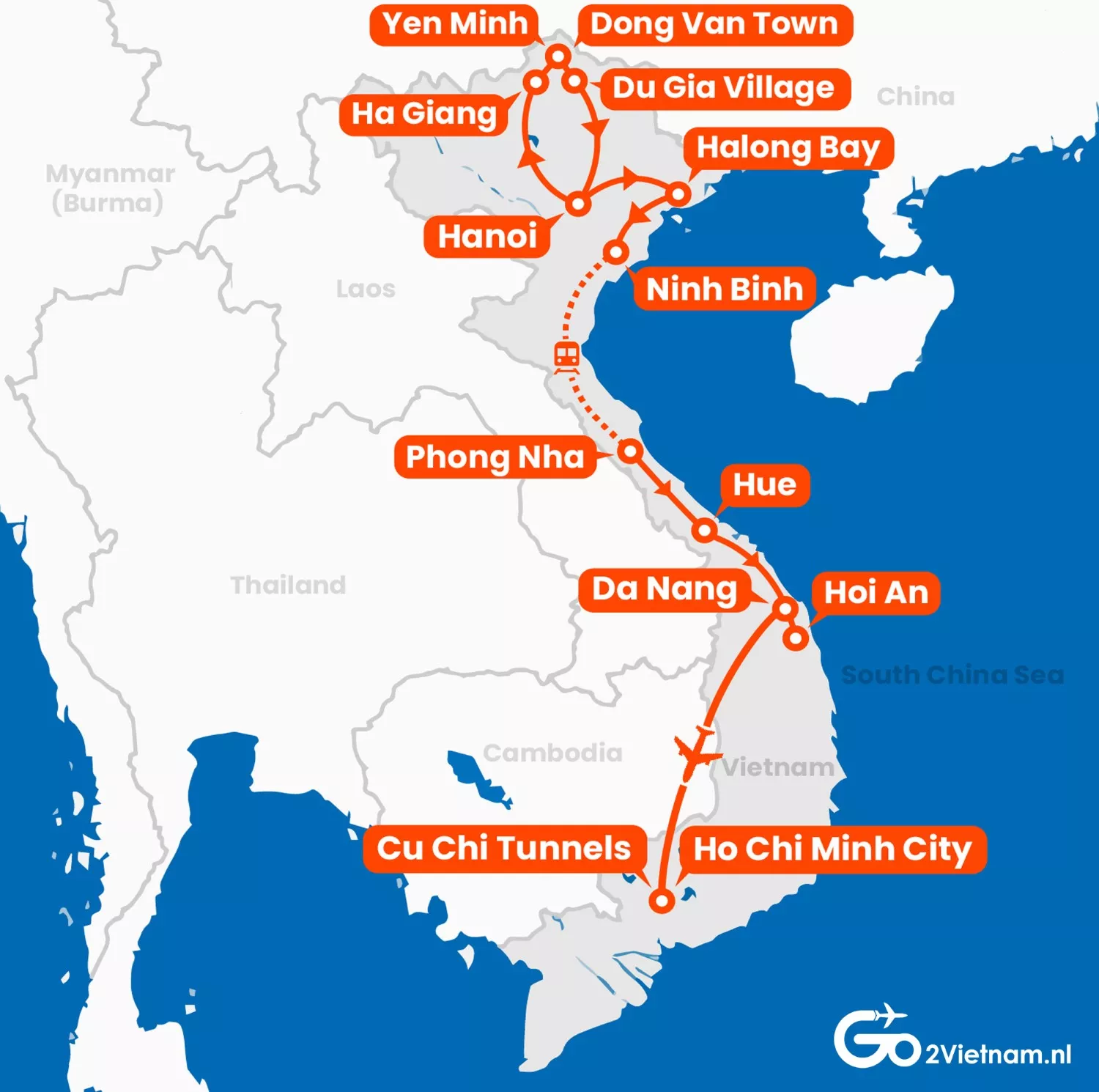 Maar je bezoekt ook Hue, ooit het keizerlijk middelpunt van de Nguyen dynastie, je rijdt over een van de mooiste kustwegen ter wereld, je gaat fietsen en koken in het groentedorp Tra Que, en naar het -volgens velen- leukste stadje van het land: Hoi An. Je bezoekt de eindeloze als dominostenen aan elkaar geschoven rijstveldjes van Noord-Vietnam, maakt een cyclo tour in Hanoi en gaat naar de Cu Chi tunnels, de ondergrondse schuilplaats van de Vietcong.